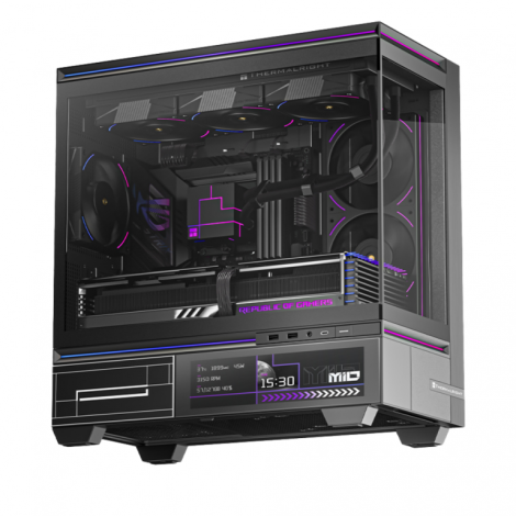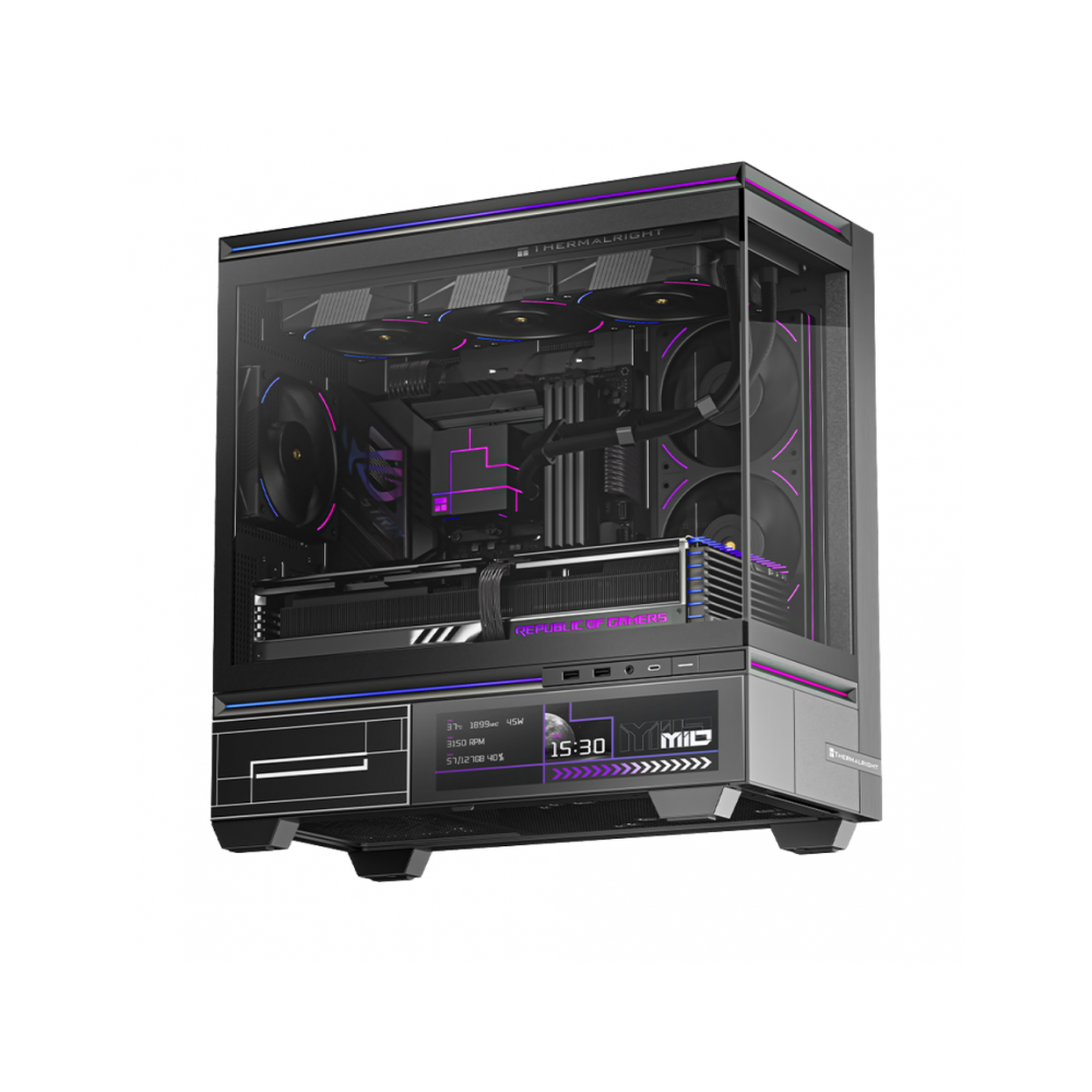 Gabinete Micro-ATX de diseño moderno en color negro, con pantalla frontal IPS HD de 9,16” y resolución 1920 × 462, panel lateral de vidrio templado, excelente flujo de aire y compatibilidad con refrigeración líquida. La pantalla es totalmente personalizable, compatible con imágenes, videos y duplicación de pantalla, ideal para setups gamers y creadores que buscan estética, tecnología y alto rendimiento en un solo chasis.